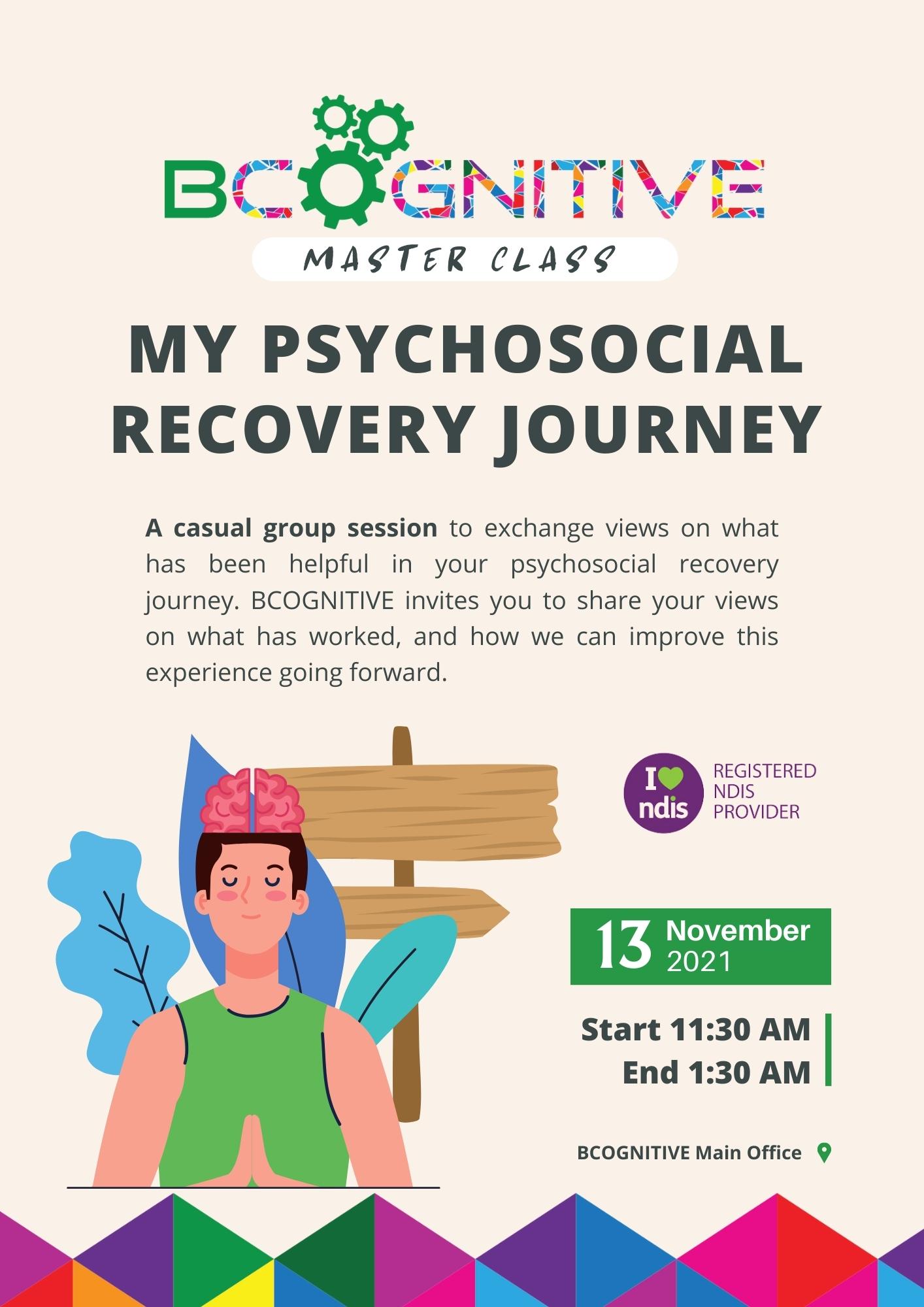 MY PSYCHOSOCIAL RECOVERY JOURNEY A casual group session to exchange views on what has been helpful in your psychosocial recovery journey. BCOGNITIVE invites you to share your views on what has worked, and how we can improve this experience going forward.